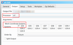 As a processor you need to select the processor matching your CNC rounter, for the Workbee select rrf. As the coordinate system choose G54 in case you use the Workbee (might as well differ for other CNC routers). Output File can be left empty, but it is recommended to specify a filename for the gcode file. If you don't specify a filename here the gcode file is called "-" and located in the same folder as your FreeCAD file. At least until FreeCAD 1.0.1 (on Linux, maybe as well other OSs) the name is not really used for the file, so if you cannot find your gcode file then for sure look for "-" as your file name.