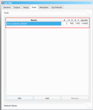 Add your tools to the list and remove all tools you don't need for your job. If you have not created your tool, then this would have to be done first. Tool creation is fairly easy and thus skipped in that guide for now. The values you enter here depend mill bit and the material you are using, check here WorkBee Schnittdaten und Fräser to get some ideas. For the workbee, the spindle speed can be set to any value, it runs anyways on one constant speed of 16000 rpm. Again for other CNC routers it might be different.
