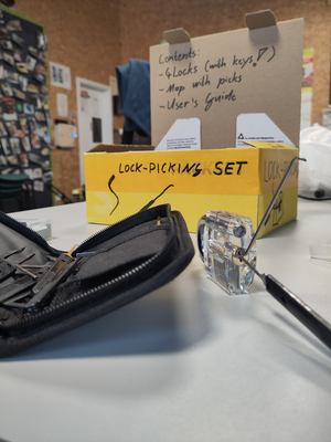 We have a set with transparent practice locks and a selection of picks and tension tools in the space. Note that they are likely too thick to work on any real locks.