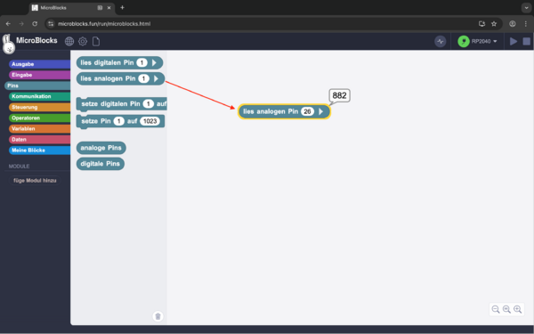 Um den Feuchtigkeits-Sensor auslesen zu können, brauchen wir den Block lies analogen Pin aus dem Menü Pins: