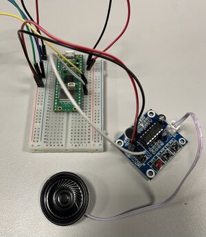 Außerdem schließen wir ein Kabel (im Bild weiß) an den P-E Pin des Lautsprecher-Moduls. Das andere Ende des Kabels stecken wir an den Pin 27 (GPIO21) des Mikrokontrollers.