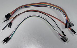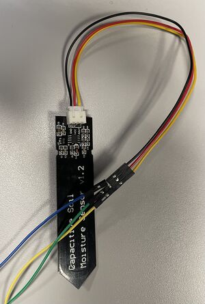 3. Als nächstes können wir den Feuchtigkeits-Sensor verbinden. Dafür müssen wir zuerst Kabel mit Steckern an beiden Enden in das Kabel des Feuchtigkeits-Sensors stecken, da wir die Kabel sonst nicht in das Steckbrett stecken können. Dann können wir das rote Kabel (VCC) des Feuchtigkeits-Sensors in die +-Schiene und das schwarze Kabel (GND) in die --Schiene stecken, sodass der Sensor mit 3 Volt Spannung versorgt wird.