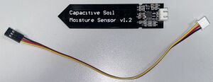• Der gelesene Wert wird von dem Mikrokontroller ausgewertet und die Feuchtigkeit in Prozent umgerechnet (100% = komplett nass, steht zum Beispiel in einem Glas Wasser; 0% ist völlig trocken, zum Beispiel, wenn man den Sensor in der Luft hält und er trocken ist)