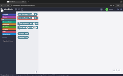 Nun ist MicroBlocks mit dem Mikrokontroller verbunden und bereit, durch das Ziehen und Verbinden der verschiedenen Blöcke den Mikrokontroller zu programmieren.