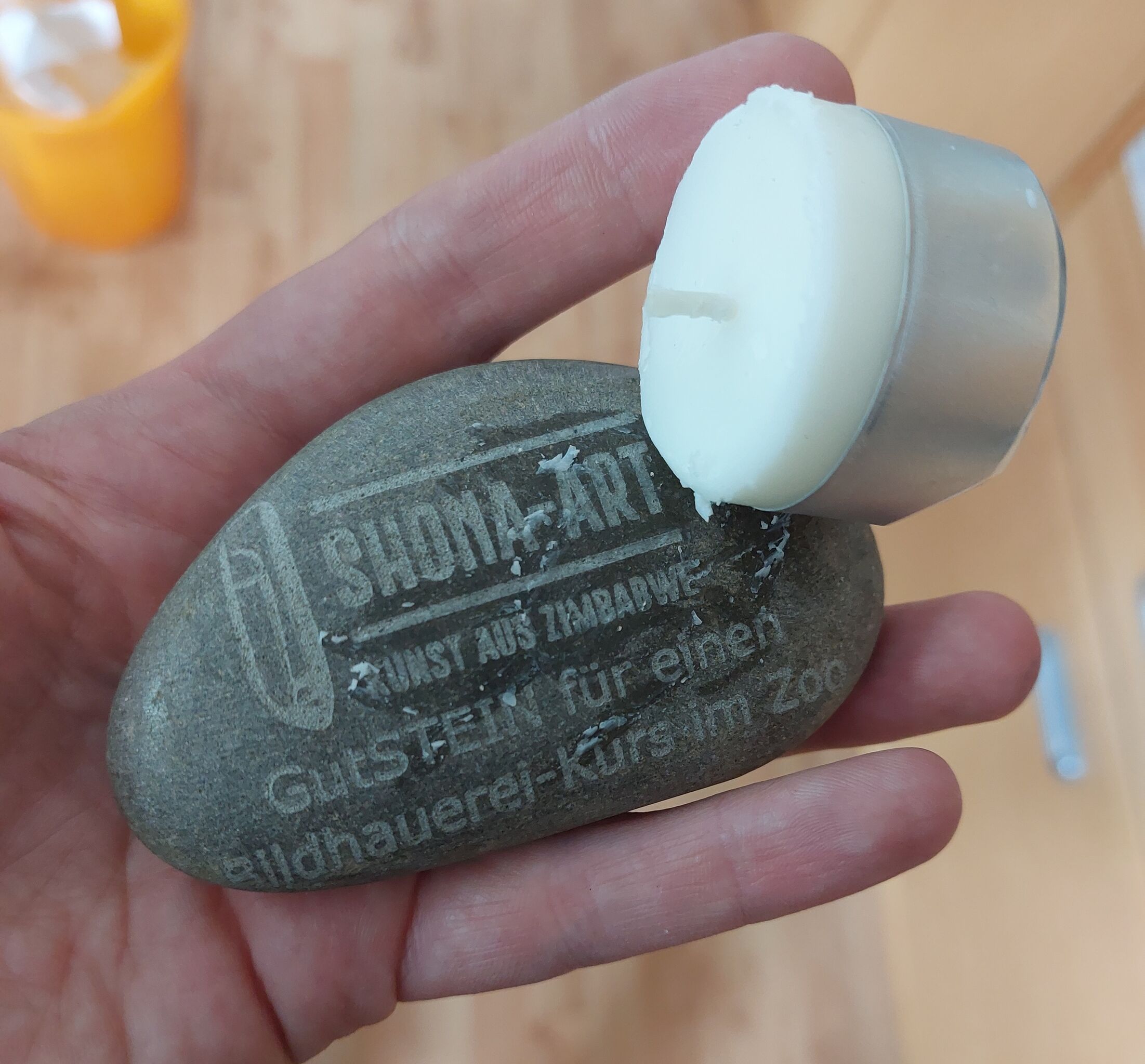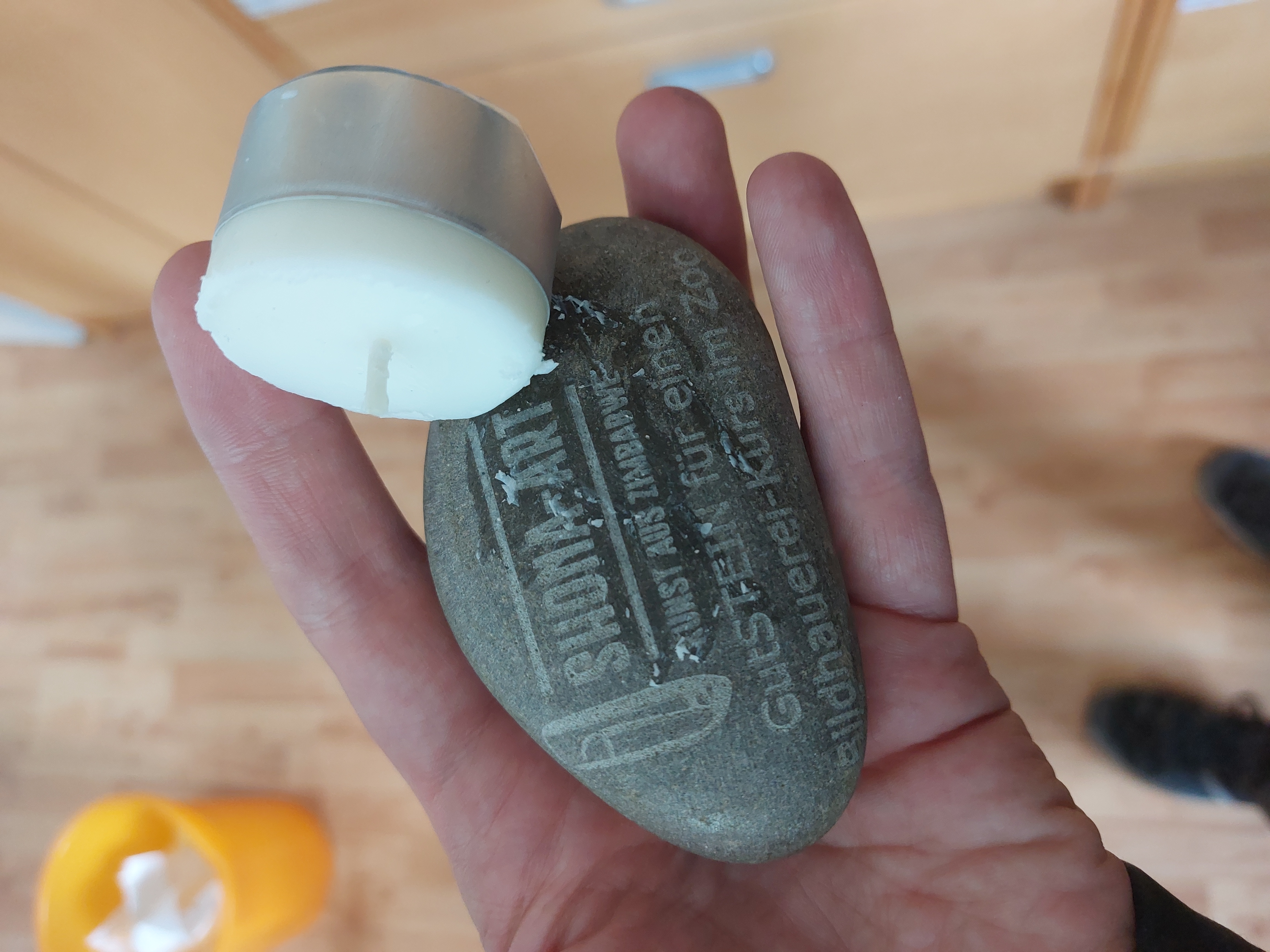 applying paraffin wax from a tea light to make a laser engraving "pop" on a stone